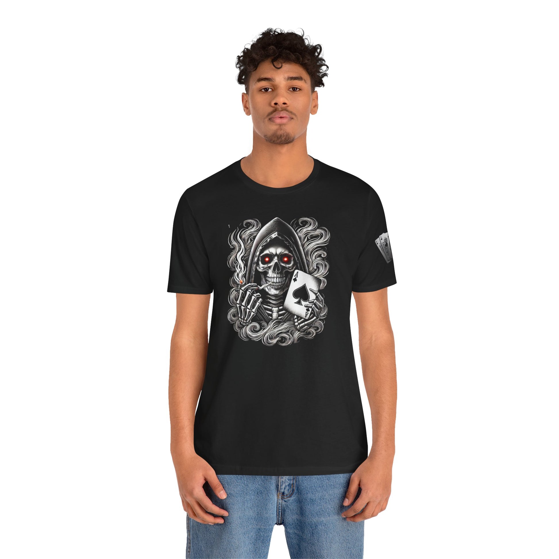 This skull poker cards T-Shirt gives off a cool and edgy vibe, perfect for those who love quirky and unique designs. It's a great addition to any casual outfit, and is relevant for Halloween, game nights, and poker enthusiasts.