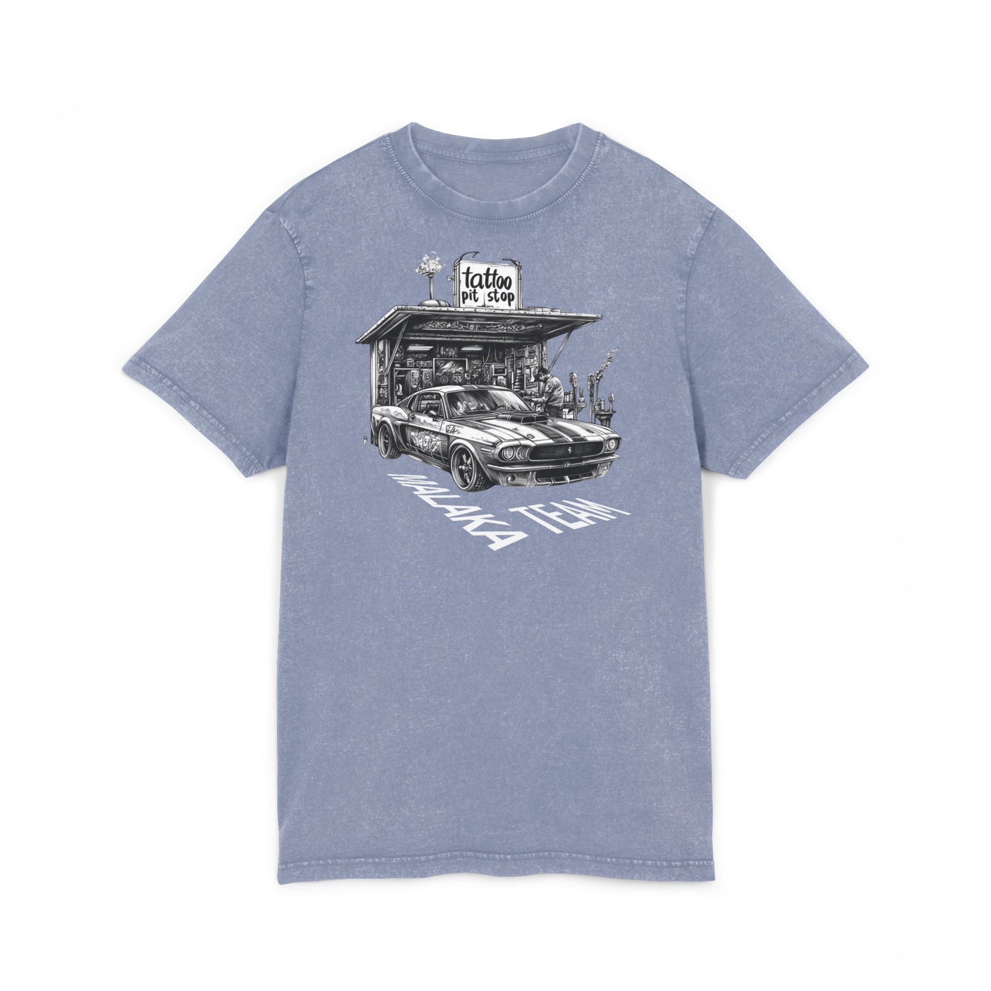This acid washed round neck tee features a Pit Stop Tattoo Shop USA Muscle car design, giving off a vintage and edgy vibe. Perfect for those who love muscle cars and tattoos, this tee is a great addition to any casual outfit. Ideal for car enthusiasts, tattoo lovers, and those who appreciate a retro aesthetic. Great for wearing to car shows, tattoo conventions, or casual outings.