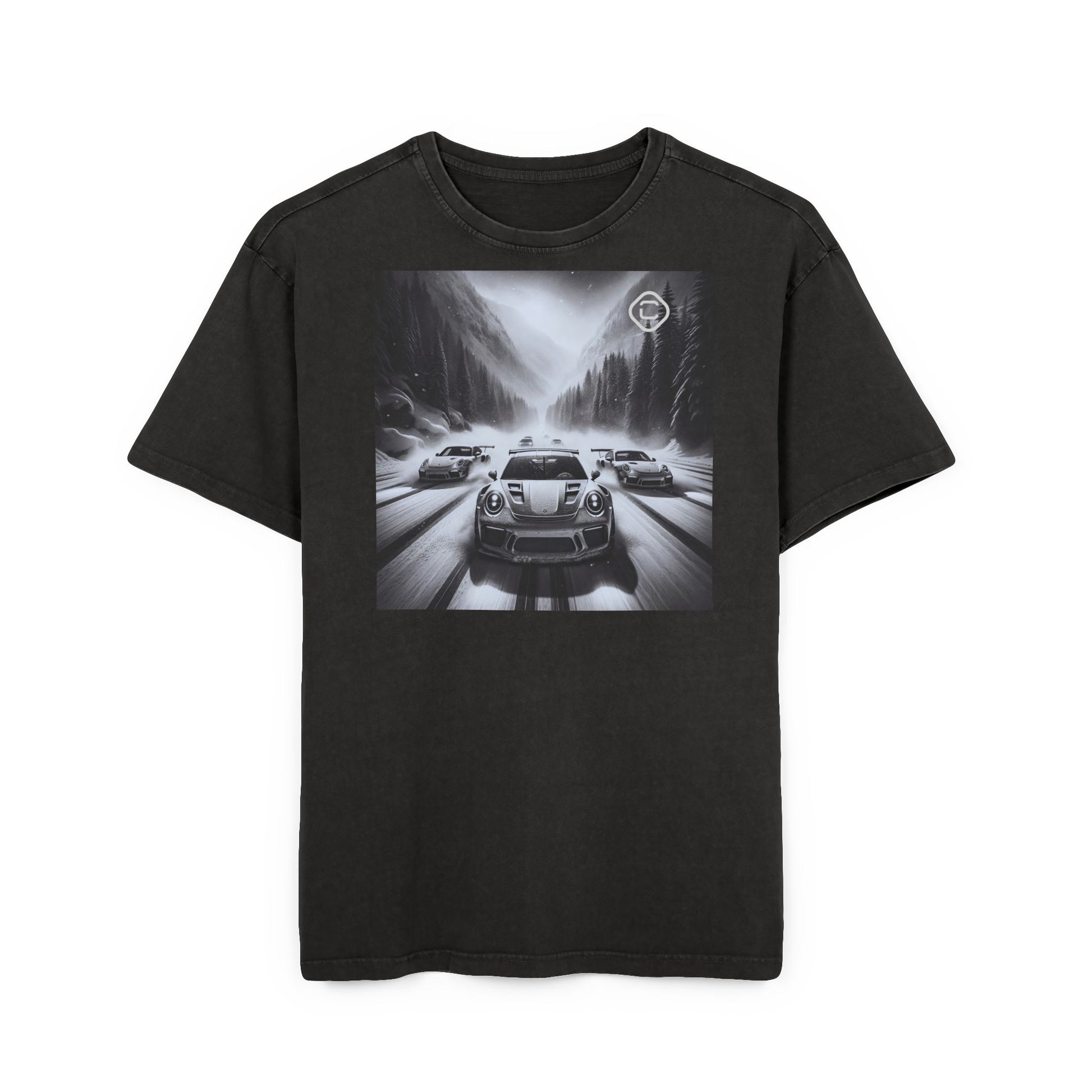 A men's acid washed heavy oversize tee featuring racing cars on snow. This tee gives off a cool and edgy vibe, perfect for casual wear and street style enthusiasts. Ideal for adults looking for a unique and eye-catching shirt. Great for winter holidays and sports enthusiasts.